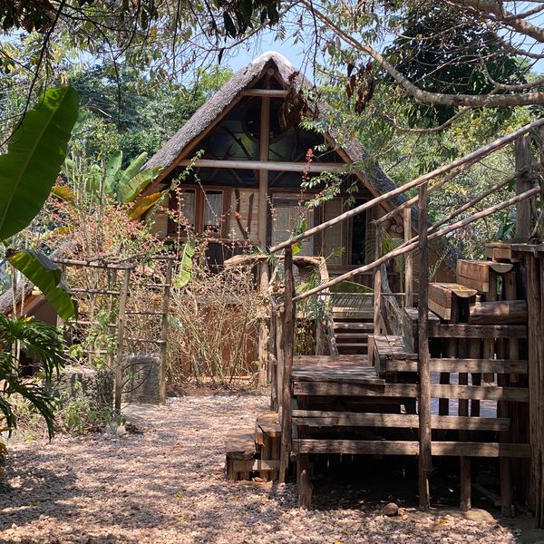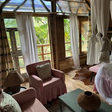 This intimate spacious cottage, is surrounded by lush vegetation, with distinctive artistry featuring a king size bed, an indoor bath tub and a private balcony.